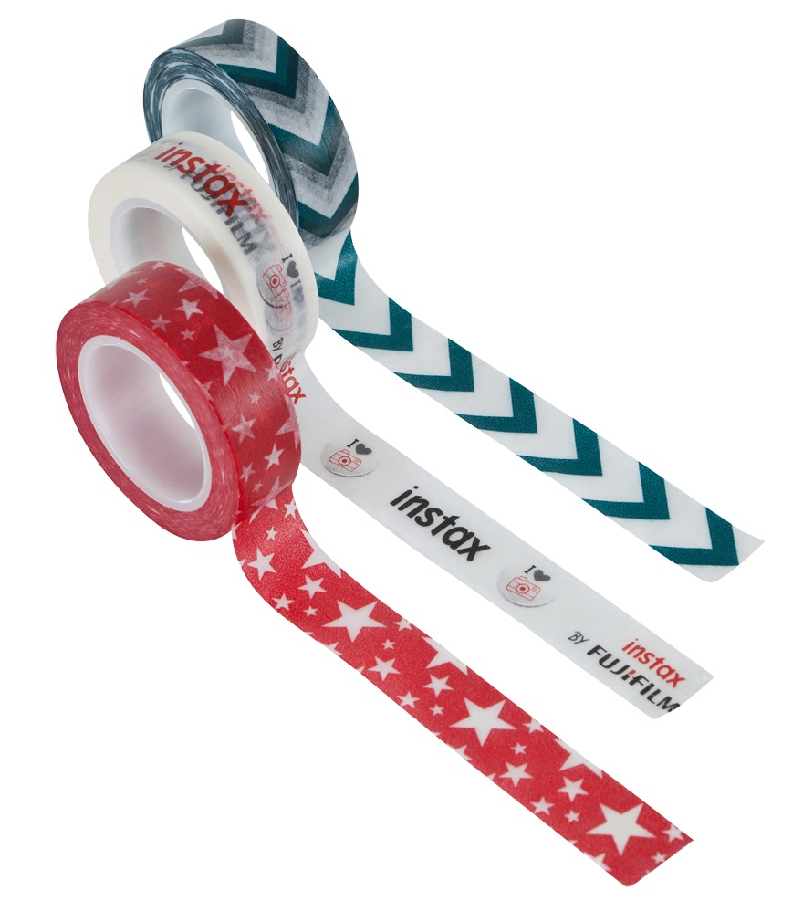 Varios: 3 cintas adhesivas para personalizar tus películas Instax, Incluye una cinta con el logo de Instax, una cinta de chevron sobre fondo blanco y una cinta con estrellas blancas sobre fondo rojo